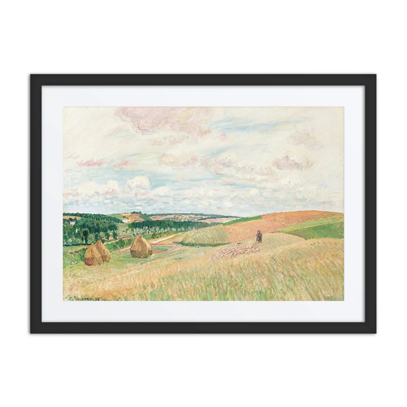 A pastoral landscape depicts rolling hills dotted with haystacks and a shepherd with his flock under a cloudy sky, characteristic of Pissarro’s focus on rural life and plein-air painting.